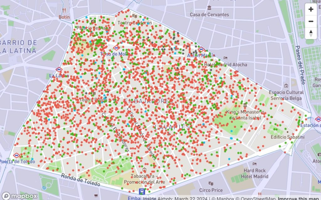 Mapa de las más de 2.250 viviendas de uso turístico que, según Inside Airbnb, hay en Embajadores