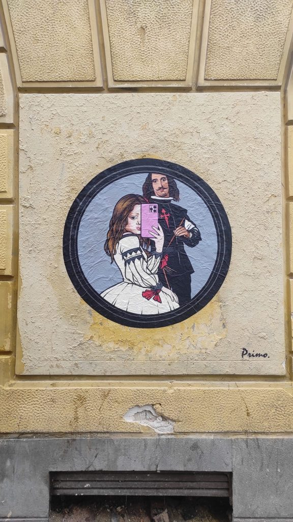 «La anterior menina ya ni cabeza tenía», comenta el artista a xLavapiés sobre el reemplazo de su obra. «Decidí darle una nueva visión con este selfie moderno y hacer una Margarita influencer que dice «¡Diego colócate que sales en la foto!», al contrario que en el cuadro».