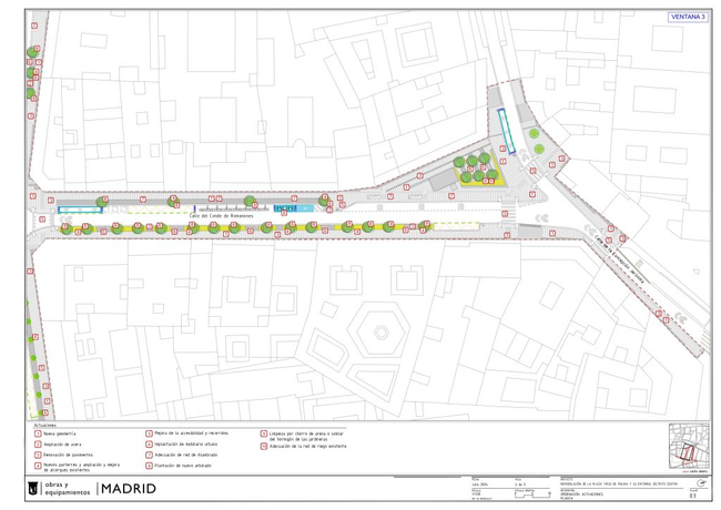 El Ayuntamiento adelantó las líneas generales de una reforma que «eliminará barreras arquitectónicas, fondos de saco y espacios inseguros y renovará el mobiliario urbano y los juegos infantiles» de Tirso de Molina, al tiempo que «supondrá una mejora ambiental de la zona gracias a la creación de más espacios verdes y la plantación de 46 árboles y más de 2.500 arbustos«. También, según el Consistorio, la reforma de las calles del entorno de la plaza «permitirá ordenar la movilidad y crear nuevas paradas de autobús para descongestionar Tirso de Molina y Jacinto Benavente».