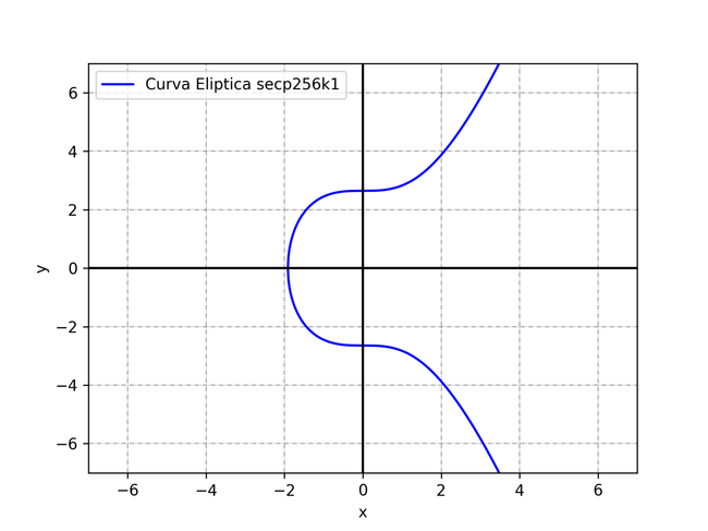 Gráficamente, la Curva Elíptica secp256k1 presenta simetría respecto al eje x. Esto significa que, para un valor dado de x, la coordenada en y puede tomar dos valores: positivo o negativo.