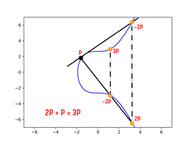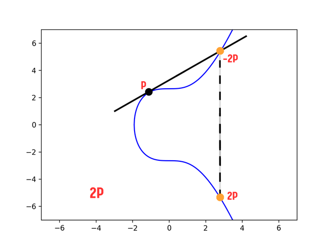Y ahora consideremos como sumar un punto a si mismo, es decir, si tenemos el punto “P” queremos obtener “2P”. Para ello trazaremos una tangente al punto que queremos duplicar. Allá donde cruce la tangente, será -2P. Reflejamos -2P respecto del eje x, y obtenemos 2P.