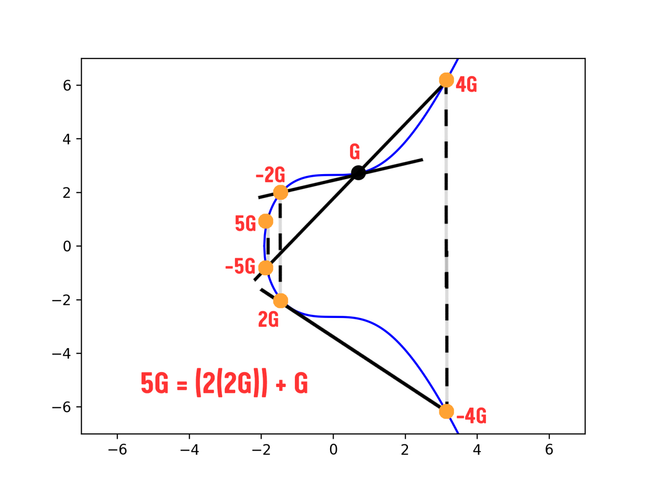 Apliquemos esto al Punto Generador (G). Imaginemos que se encuentra en la coordenadas (1, 2.82) y queremos obtener 5G, suponiendo que 5 es el valor de la Clave Privada. Una forma de hacerlo será duplicar G, volverlo a duplicar y finalmente sumarle la G original. Las coordenadas del punto 5G resultante serán las de la Clave Pública: