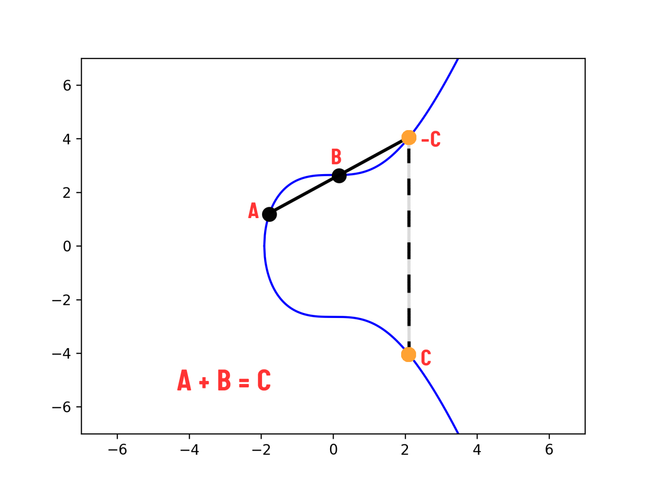 Imaginemos que hay que sumar los puntos “A” y “B” sobre la Curva Elíptica. Para ello trazaremos una recta que pase por ambos, y el punto donde ésta cruce de nuevo la curva, será la suma de ambos en negativo “-C”. Ahora reflejamos ese mismo punto respecto del eje x, obteniendo así el punto “C”, el cual es la suma de A y B.