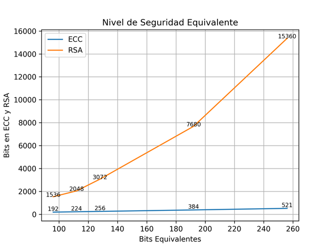 Para este nivel de seguridad, con ECC necesitamos la curva «secp256k1» que genera claves de 256 bits de longitud, mientras que con RSA necesitaríamos generar claves de 3072 bits de longitud. Es evidente que ECC es mucho más eficiente.