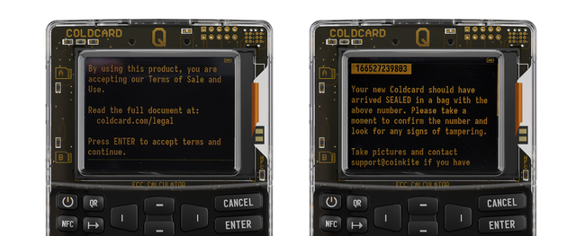 Una COLDCARD Q o MK4 llega siempre en una bolsa sellada con un número de serie estampado.