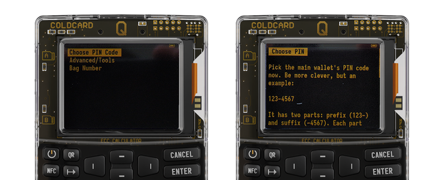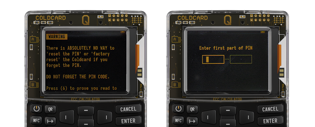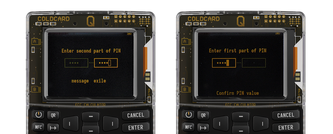 Los PIN en COLDCARD tienen 2 partes. Cada parte debe tener entre 2 y 6 dígitos y te los piden en dos momentos distintos durante cada inicialización. Utiliza 4 y 4 como algo suficiente. Después de leer toda la explicación le damos a ENTER