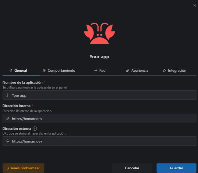 Es muy sencillo, ponemos nombre, ponemos ip interna y si tenemos una externa diferente la especificamos. Yo siempre uso la misma o en ocasiones pongo en la externa el dominio que asigno con NPM y en la interna la IP:Puerto.