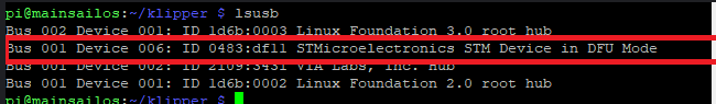 Si ya tenemos la impresora en modo DFU y hacemos un lsusb sobre la Oragenpi conectada a la impresora con USB, veremos algo como esto.