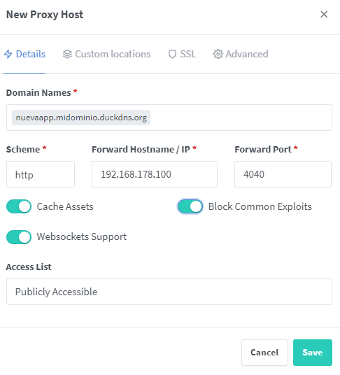 Una vez tenemos el certificado SSL ya podemos añadir un Host. Os pongo un ejemplo. Con esto ya puedes apuntar a todas tus aplicaciones y acceder con HTTPS en vez de HTTP. Aplicaciones como Vaultwarden es obligatorio este uso.