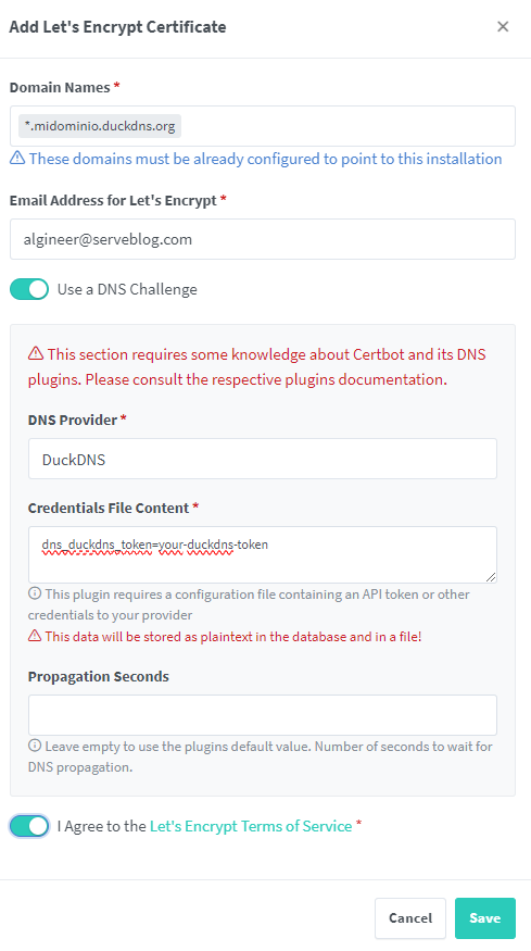 Lo rellenamos como en la siguiente imagen pero sustituyendo el dominio, correo y token de Duckdns.