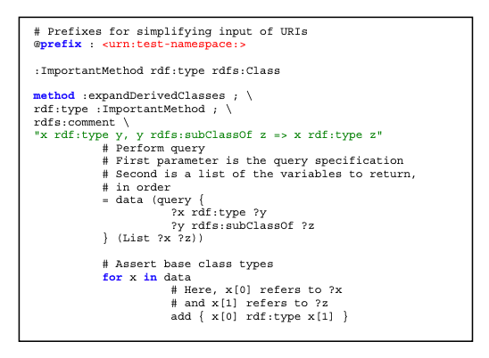 In a system such as Haystack, a sizeable amount of code is devoted to creation and manipulation of RDF-encoded metadata. We observed early on that the development of a language that facilitated the types of operations we frequently perform with RDF would greatly increase our productivity. As a result, we have created Adenine. An example snippet of Adenine code is given in Figure 6.