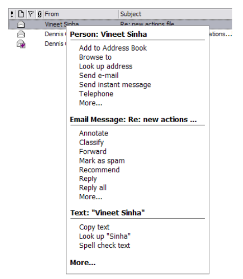 Figure 5 gives a sample context menu that will be implemented for an upcoming release. The menu is divided into several sections, each listing the commands for a particular semantic entity or Ozone part. The email author entity named “Vineet Sinha” is given the first section. The email message entity is given the next section. Finally the text label used to display the contact’s name is given the third section. Commands for other semantic
