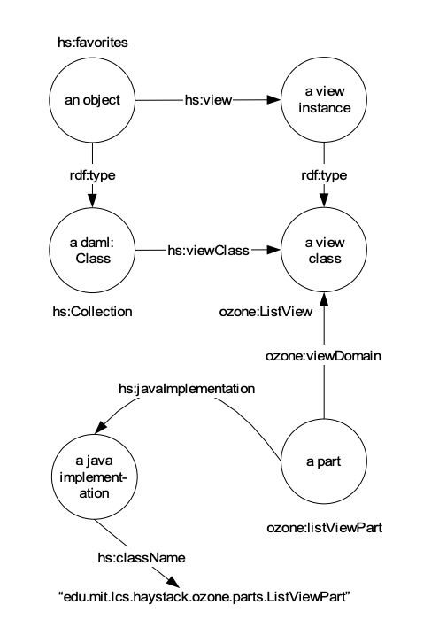 Once a view instance exists and its view class is known, Ozone queries for a part whose view domain (ozone:viewDomain) is the class of the given view instance. In this example, the part ozone:listViewPart is found. Ozone then finds the implementation of this part, instantiates the corresponding Java class, and initializes it with the semantic entity.