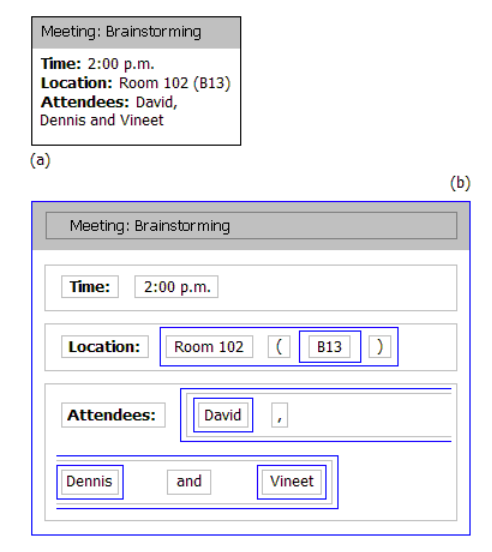Figure 1 shows an example of how the various types of parts work together to present a meeting. Part (a) of the figure shows the end result while part (b) shows the internal wiring. The view part responsible for displaying the meeting employs a vertically splitting layout part to partition the display into two rows: the top row embeds an informative part that renders the title of the meeting; the bottom row contains the details of the meeting. The bottom row in turn contains a stacking layout part that stacks three fields “Time,” “Location,” and “Attendees” vertically.