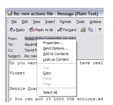 Figure 4. Actions for a contact name in the email compose window (Microsoft Outlook XP)