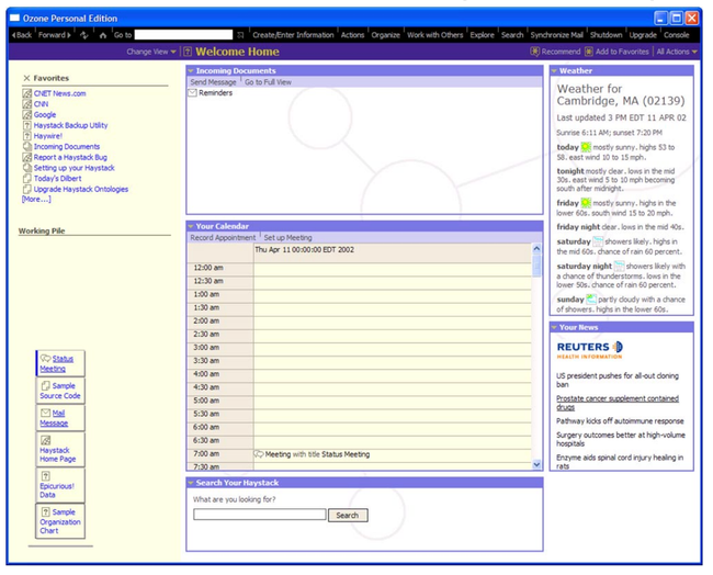 The second benefit of user interface metadata is that, like any other type of data, the user interface metadata can be saved, published, and shared. The ability to publish user interface metadata is particularly attractive. Consider a scenario in which a new employee enters a company with a large intranet. This intranet offers countless useful resources to the new employee, but because of its sheer volume, it is intimidating to get used to. Fortunately, other employees have over time collected a selection of Ozone parts that provide access to the most useful features of the intranet. The new employee can simply make use of these parts as a starting point. These parts are brought into the employee’s Haystack and tailored based on his or her preferences. These parts can interact with the employee’s Haystack and perform automatic customization that makes Haystack much more powerful than a static web page listing a set of useful links to the intranet.