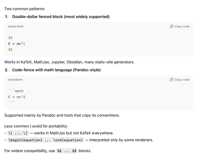 The importer currently does not reliably process math formats. The issue is that there is no single standard for writing math in Markdown, making consistent import difficult. Different Patterns used in Markdown: