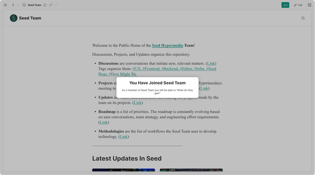 If the user Joins a site that is set to “Open membership” then they will gain the access set by that role. They will get told on the notification what permissions they have gained according to what has been set on the site. A new event will appear on the site feed notifying about the new member.