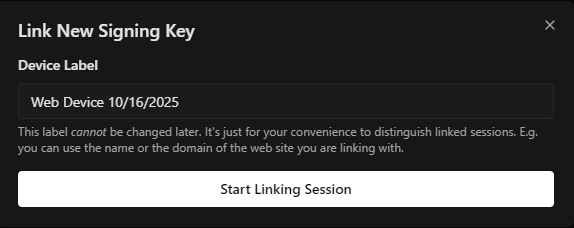 It says "Link new signing key" but on the web it was mentioned that you would be linking identities or accounts. As I mentioned before, "keys" mean nothing to most people and even if users know what you are talking about it important to maintain consistency with the language. "Linking sessions" is also a new terminology that wasn't used before and may cause confusion.