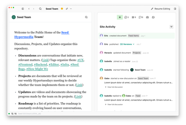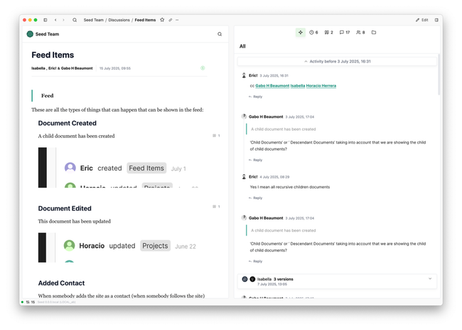 Action Two: Gabo clicks the Seed Team Item and Lands on the Activity Feed with the latest event at the top.
