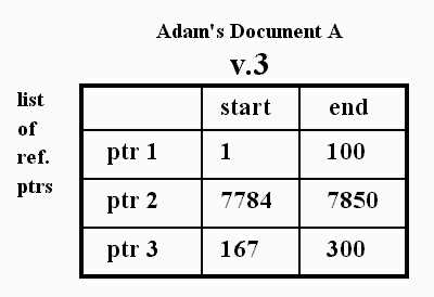 Though the content may appear on the screen as an ordinary block of text, structurally its chief representation is a list of contents-- a sequence of reference pointers.  These pointers designate spans of characters (or other elements) (Figure 8).  These spans, concatenated to make a virtual stream of the designated elements, thus represents the sequential text of Figure 7.