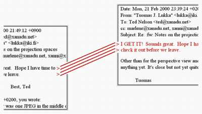 It has always been much more ambitious, proposing an entire form of literature where links do not break as versions change; where documents may be closely compared side by side and closely annotated; where it is possible to see the origins of every quotation; and in which there is a valid copyright system-- a literary, legal and business arrangement-- for frictionless, non-negotiated quotation at any time and in any amount.  The Web trivialized this original Xanadu model, vastly but incorrectly simplifying these problems to a world of fragile ever-breaking one-way links, with no recognition of change or copyright, and no support for multiple versions or principled re-use.  Fonts and glitz, rather than content connective structure, prevail.