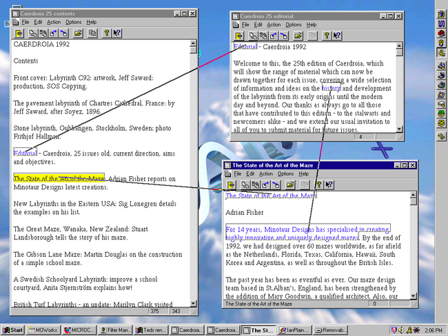 Fig. 5.  Screen shot of transpointing windows by Ka-Ping Yee, showing his PYXI viewer served from Udanax Green server (xu88 model).  Only transclusions happen to be shown, though PYXI also handles content links.