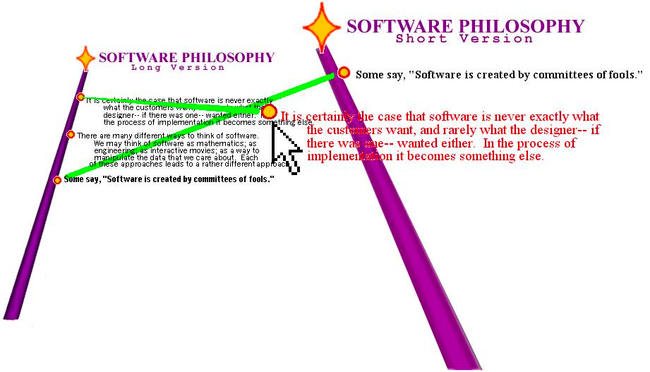 Making transpointing windows come true has always been a key milestone for the Xanadu Project.  These self-explanatory pictures have been the simplest sharable tokens inside and outside the group.  You do not have to understand computer technicalities (let alone ours, new or old) to understand this visualization, or see its importance.  We are amazed that the goal of making it possible for people to work with transpointing windows appears not to have been embraced by anyone else in the computer field.  (A search at Google.com for "transpointing windows" on 7 May 2000 found only ten references.).