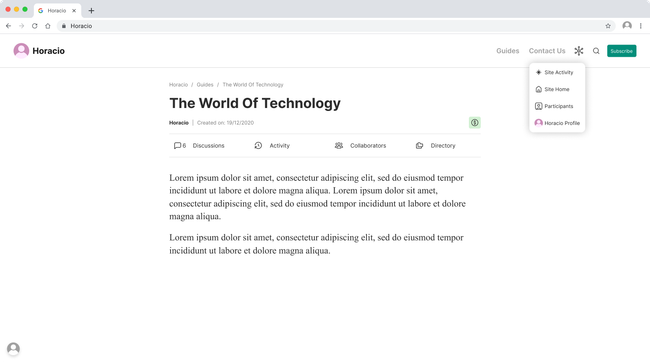 The navigation between this identities will be done though the site navigation at the top bar and in the hamburger menu on mobile.