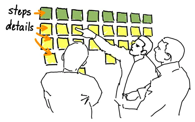 Building a map is dead simple. Working together with others, I’ll tell the story of a product, writing each big step the users take in the story on sticky notes in a left-to-right flow. Then, we’ll go back and talk about the details of each step, and write those details down on sticky notes and place them vertically under each step. The result is a simple grid-like structure that tells a story from left to right, and breaks it into details from top to bottom. It’s fun and fast. And those details make a better backlog of stories for our Agile development projects.