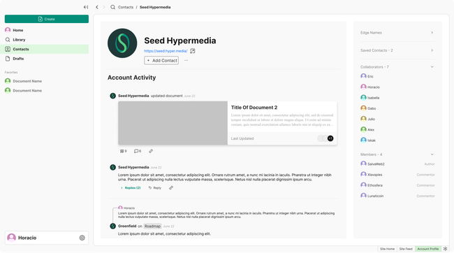 The profile view will be contained in the contacts page. Here users can navigate though the profile which will contain account activity, collaborator list, members list (authors and commentors) and any other relevant information.
