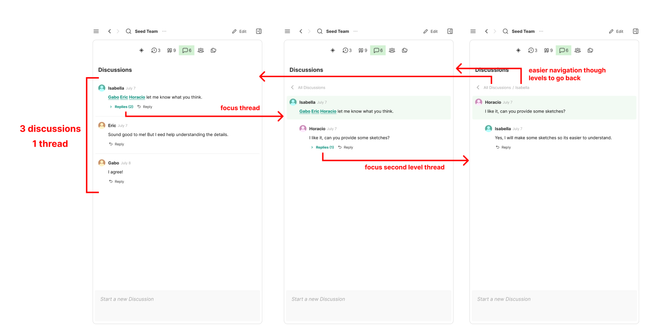 I propose that you don't see the children of the discussion only when you focus it. You should also not see the parent.