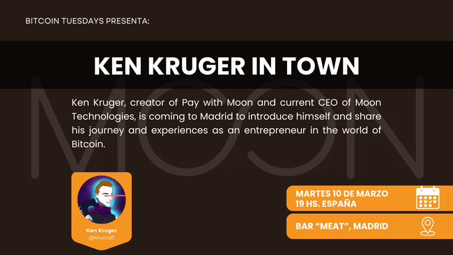 Ken Kruger, creator of Pay with Moon and current CEO of Moon Technologies, is coming to Madrid to introduce himself and share his journey and experiences as an entrepreneur in the world of Bitcoin.