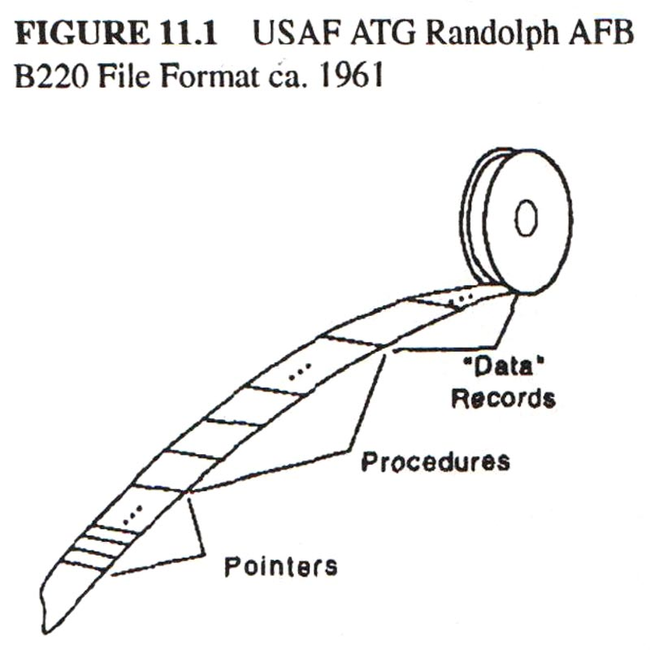 Force. The first was on the Burroughs 220 in the form of a style for transporting files from one Air Training Command installation to another. There were no standard operating systems or file formats back then, so some (to this day unknown) designer decided to finesse the problem by taking each file and dividing it into three parts. The third part was all of the actual data records of arbitrary size and format. The second part contained the B220 procedures that knew how to get at records and fields to copy and update the third part. And the first part was an array of relative pointers into entry points of the procedures in the second part (the initial pointers were in a standard order representing standard meanings). Needless to say, this was a great idea, and was used in many subsequent systems until the enforced use of COBOL drove it out of existence.