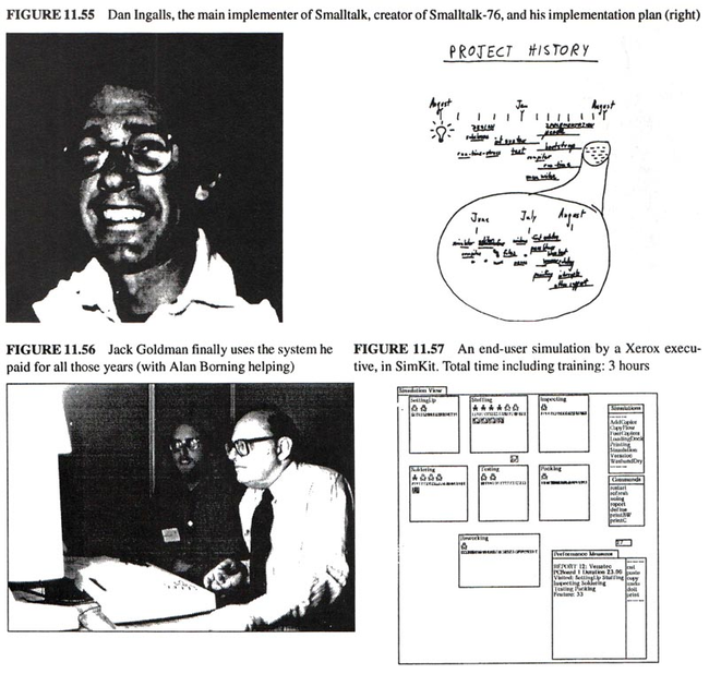 On the morning of the "big day" Ted Kaehler decided to make a change in the virtual memory system OOZE to speed it up a little. We all held our breaths, but such was the clarity of the design and the confidence of the implementers that it did work, and the executive hands-on was a howling success. About an hour into the first session one of the VPs (who had written a few programs in FORTRAN 15 years before) finally realized he was programming and mused "so it's finally come to this." Nine out of the ten executives were able to finish a simulation problem that related to their specific interests. One of the most interesting and sophisticated was a PC board production line done by the head of a Xerox owned company using actual figures (that he carried around in his head) to prime a model that could not be solved easily by closed form mathematics—it revealed a serious flaw in the disposition of workers given the line's average probability of manufacturing defects.