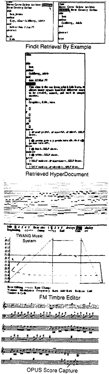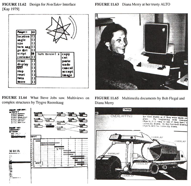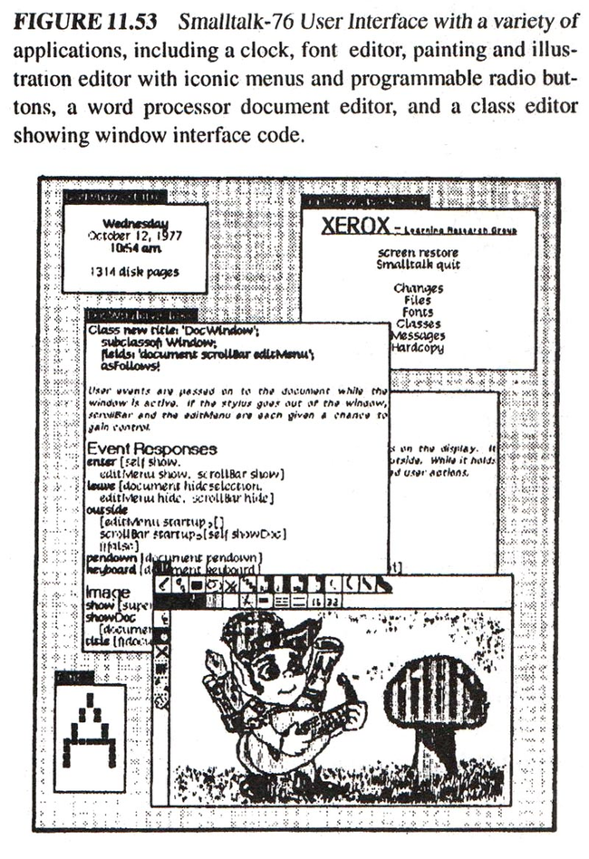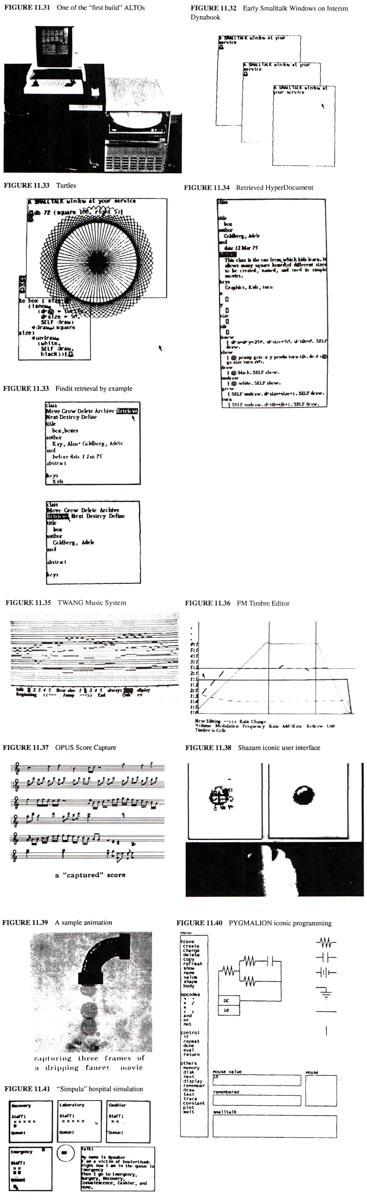 Putting all this together, we want an apparently free environment in which exploration causes desired sequences to happen (Montessori); one that allows kinesthetic, iconic, and symbolic learning—"doing with images makes symbols" (Piaget & Bruner); the user is never trapped in a mode (GRAIL); the magic is embedded in the familiar (Negroponte); and which acts as a magnifying mirror for the user's own intelligence (Coleridge). It would be a great finish to this story to say that having articulated this we were able to move straightforwardly to the design as we know it today. In fact, the UI design work happened in fits and starts in between feeding Smalltalk itself, designing children's experiments, trying to understand iconic construction, and just playing around. In spite of this meandering, the context almost forced a good design to turn out anyway. Just about everyone at PARC at this time had opinions about the UI, ours and theirs. It is impossible to give detailed credit for the hundreds of ideas and discussions. However, the consolidation can certainly be attributed to Dan Ingalls, for listening to everyone, contributing original ideas, and constantly building a design for user testing. I had a fair amount to do with setting the context, inventing overlapping windows, etc., and Adele and I designed most of the experiments. Beyond that, Ted Kaehler, and visitor Ron Baecker made highly valuable contributions. [Dan Halbert] designed SmallStar, the prototype iconic interface for the Xerox Star product.