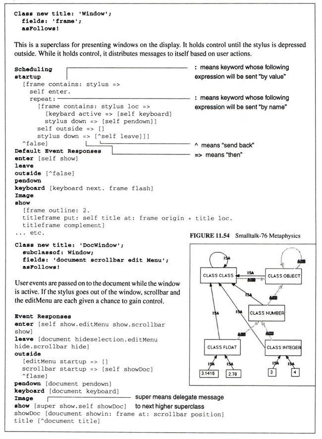 Adele decided to drive the documentation and release process for a new Smalltalk that could be distributed widely almost regardless of the target hardware. Only a few changes had to be made to the NoteTaker Smalltalk-78 to make a releasable system. Perhaps the change that was most ironic was to turn the custom fonts that made Smalltalk more readable (and were a hallmark of the entire PARC culture) back into standard pedestrian ASCII characters. According to Peter Deutsch this "met with heated opposition within the group at the time, but has turned out to be essential for the acceptance of the system in the world." Another change was to make blocks more like lambda expressions which, as Peter Deutsch was to observe nine years later: "In retrospect, this proliferation of different kinds of instantiations and scoping was probably a bad idea." The most puzzling strange idea—at least to me as a new outsider—was the introduction of metaclasses (really just to make instance initialization a little easier—a very minor improvement over what Smalltalk-76 did quite reasonably already). Peter's 1989 comment is typical and true: "metaclasses have proven confusing to many users, and perhaps in the balance more confusing than valuable." In fact, in their PIE system, Goldstein and Bobrow had already implemented in Smalltalk an "observer language", somewhat following the view-oriented approach I had been advocating and in some ways like the "perspectives" proposed in KRL [Goldstein *]. Once one can view an instance via multiple perspectives even "semi-metaclasses" like Class Class and Class Object are not really necessary since the object-role and instance-of-a-class-role are just different views and it is easy to deal with life-history issues including instantiation. This was there for the taking (along with quite a few other good ideas), but it wasn't adopted. My guess is that Smalltalk had moved into the final phase I mentioned at the beginning of this story, in which a way of doing things finally gets canonized into an inflexible belief structure.