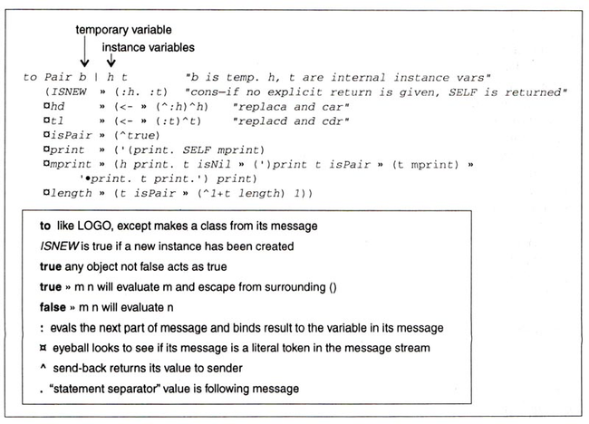 Using these the children could look at a situation they wanted to simulate, and decompose it into classes and messages without having to worry just how a method would work. The method planning could then be done informally in English, and these notes would later serve as commentaries and guides to the writing of the actual code. This was a terrific idea, and it worked very well.