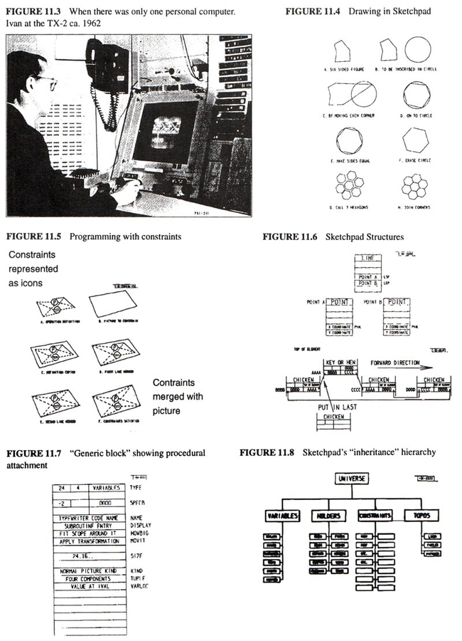 Every newcomer got one. The title was "Sketchpad: A man-machine graphical communication system" [Sutherland, 1963]. What it could do was quite remarkable, and completely foreign to any use of a computer I had ever encountered. The three big ideas that were easiest to grapple with were: it was the invention of modern interactive computer graphics; things were described by making a "master drawing" that could produce "instance drawings"; control and dynamics were supplied by "constraints," also in graphical form, that could be applied to the masters to shape an inter-related parts. Its data structures were hard to understand—the only vaguely familiar construct was the embedding of pointers to procedures and using a process called reverse indexing to jump through them to routines, like the 220 file system [Ross, 1961]. It was the first to have clipping and zooming windows—one "sketched" on a virtual sheet about 1/3 mile square!