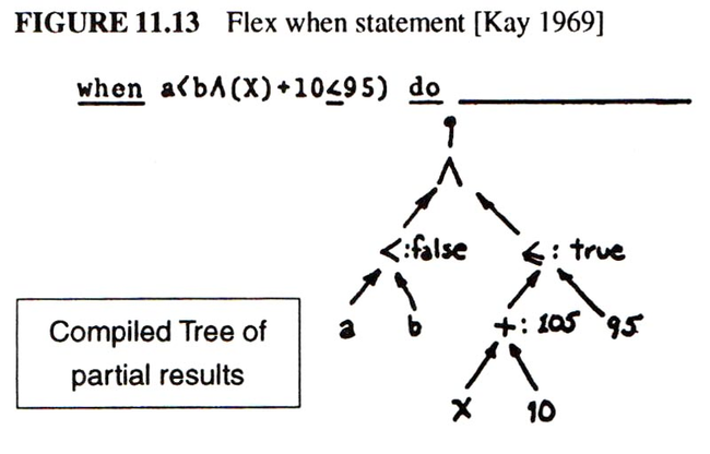 Another control structure of interest in FLEX was a kind of event-driven "soft interrupt" called when. Its boolean expression was compiled into a "tournament sort" tree that cached all possible intermediate results. The relevant variables were threaded through all of the sorting trees in all of the whens so that any change only had to compute through the necessary parts of the booleans. The efficiency was very high and was similar to the techniques now used for spreadsheets. This was an embarrassment of riches with difficulties often encountered in event-driven systems. Namely, it was a complex task to control the context of just when the whens should be sensitive. Part of the boolean expression had to be used to check the contexts, where I felt that somehow the structure of the program should be able to set and unset the event drivers. This turned out to beyond the scope of the FLEX system and needed to wait for a better architecture.