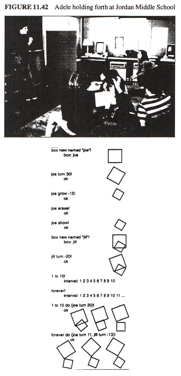 Now that I have summarized the "adult" activities (we were actually only semiadults) in Smalltalk up to 1976, let me return to the summer of '73, when we were ready to start experiments with children. None of us knew anything about working with children, but we knew that Adele Goldberg and Steve Weyer who were then with Pat Suppes at Stanford had done quite a bit and we were able to entice them to join us.