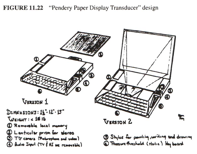 In the 1990's there will be millions of personal computers. They will be the size of notebooks of today, have high-resolution flat-screen reflective displays, weigh less than ten pounds, have ten to twenty times the computing and storage capacity of an Alto. Let's call them Dynabooks.