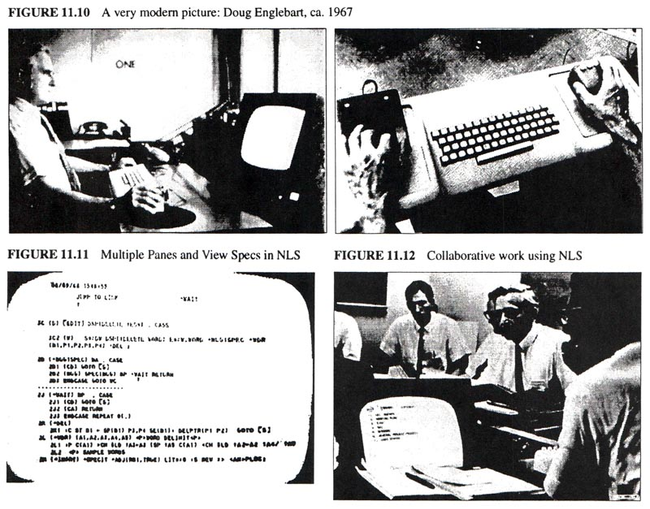 This was in early 1967, and while we were pondering the FLEX machine, Utah was visited by Doug Engelbart. A prophet of Biblical dimensions, he was very much one of the fathers of what on the FLEX machine I had started to call "personal computing." He actually traveled with his own 16mm projector with a remote control for starting and stopping it to show what was going on (people were not used to seeing and following cursors back then). His notion on the ARPA dream was that the destiny of oNLine Systems (NLS) was the "augmentation of human intellect" via an interactive vehicle navigating through "thought vectors in concept space." What his system could do then—even by today's standards—was incredible. Not just hypertext, but graphics, multiple panes, efficient navigation and command input, interactive collaborative work, etc. An entire conceptual world and world view [Engelbart 68]. The impact of this vision was to produce in the minds of those who were "eager to be augmented" a compelling metaphor of what interactive computing should be like, and I immediately adopted many of the ideas for the FLEX machine.